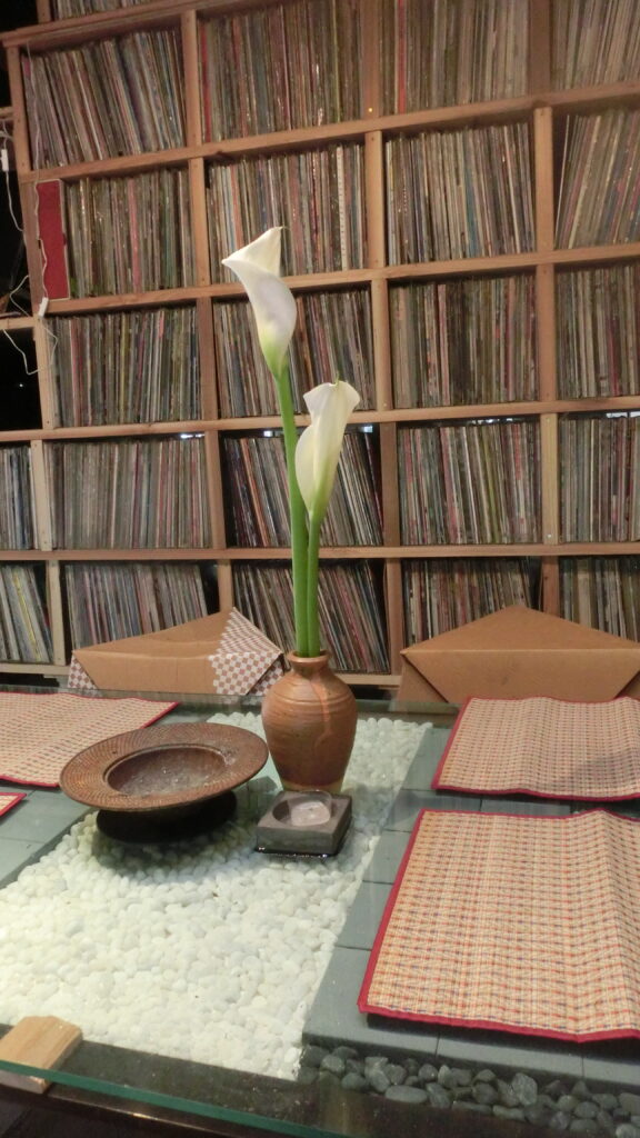 • ギャラリースペース①: 大きなテーブルと陶器展示