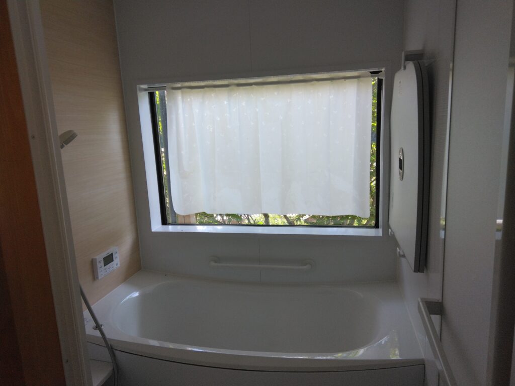 現代的な設備の浴室。緑を眺めながらゆっくりと