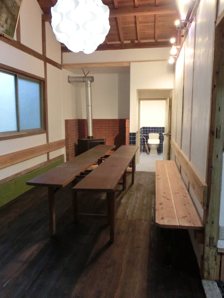木製の棚と長椅子が配置された空間。古民家の温もりを感じながら、ゆったりとお寛ぎいただけます。