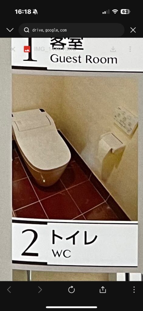 現代的なトイレ設備。赤いタイルの床が印象的。